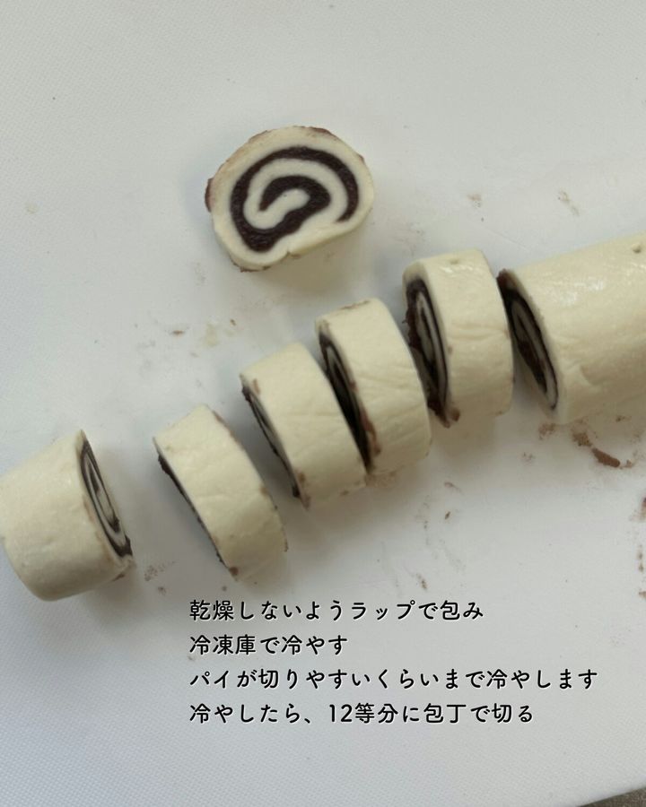 3.巻初めはしっかり巻くと、切った断面がきれいになります。最後はつまんで閉じます。閉じが甘いと焼いた時に開いてしまうので、しっかりと閉じましょう。乾燥しないようにパイをラップで包み、冷凍庫で冷やしかためます。
