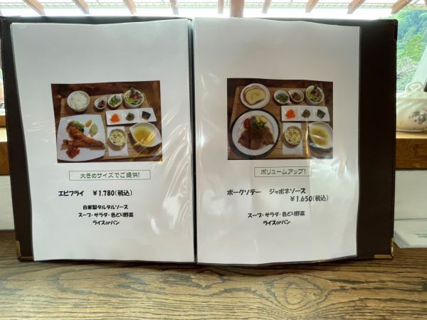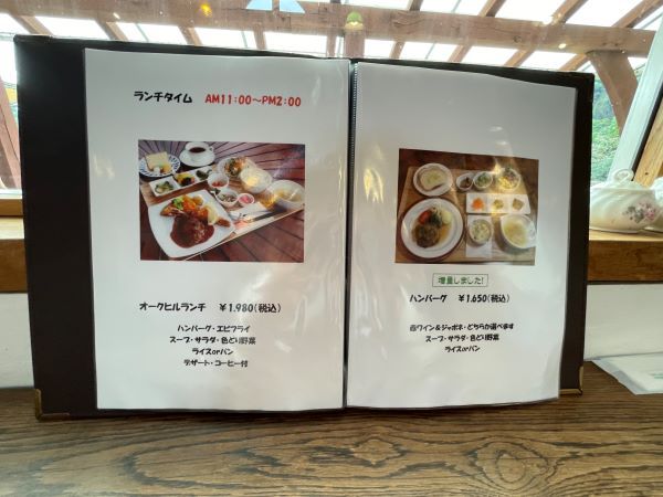 ランチタイムのメニューは5種類でした。 スタッフさんに一番人気を尋ねると、「オークヒルランチ」とのことでした。 「ハンバーグとエビフライの両方を食べたい人に、デザートとコーヒーもついてお得なメニュー」と説明されました。確かにデザートとコーヒーがついたセットはこの「オークヒルランチ」だけなので、店名がついたメニューは最強です。 まさに、食いしん坊の私のためのメニューだと思いましたが、今日は本命が別に有りまして・・。ハンバーグのセットも魅力ですが、今日は見るだけです。