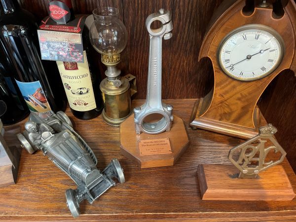 「趣味が乗り物」の ”ほっぺた親爺” は敏感に反応しました。 これは自動車のエンジン内部にある重要部品(コンロッド)です。このトロフィー、右隣のエンブレム、壁面に飾られた数枚の自動車を描いた絵画などから、相当な自動車好きとお見受けしました。 スタッフに聞くと、オーナーは相当な自動車好き‥とのこと。 次回はお会いして色々お聞きしたい。そんな気持ちになるコダワリ満載のお店でした。