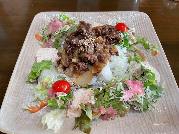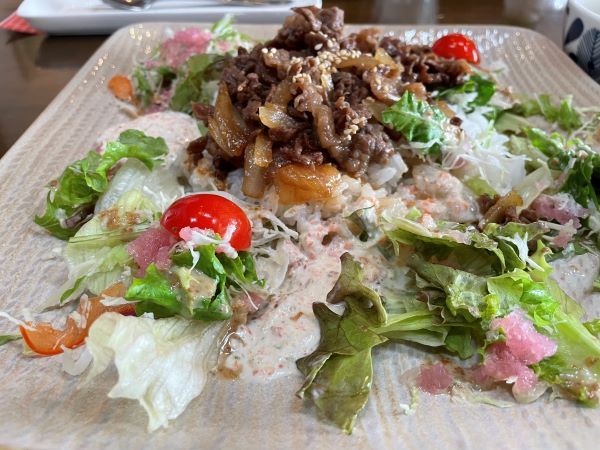 一部を崩し、これから混ぜ混ぜする直前をアップで1枚。 甘辛タレを絡めて炒めた牛肉と、タルタルソースを絡めたシャキシャキ野菜とアツアツの白米の組合せは、 "絶品"です。誰が名付けたか、佐賀の「B級グルメ」と表現するのは大変失礼。これは『A級グルメ』、『佐賀のご当地グルメ』です!これが今回の検証結果です。