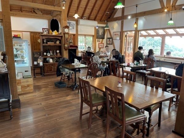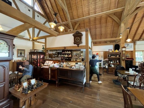 窓が大きく、開放的で明るい店内。 4人掛けのテーブルが4卓、2人掛けのテーブルが2卓、窓際に4人分のカウンター席が設けられています。元気よく店内を動き回るスタッフさんから、空いているお席にご自由にどうぞ!と促され今回は2人掛けのテーブル席です。 着席して周りを見渡すと、壁掛け時計、自動車を描いた絵画、調度品などが多く、異国の雰囲気を醸し出しています。
