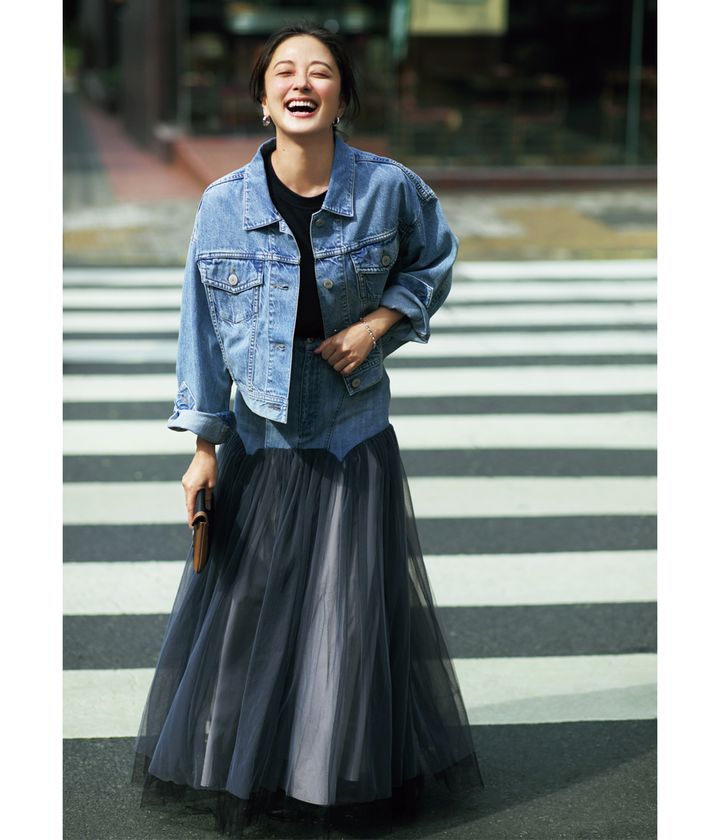 チュールをドッキングしたデニムスカートにデニムジャケットを合わせた感度高めなコーデでママ友ランチへ。パンツ合わせはハードルの高いデニムonデニムも、モードなスカートのおかげで甘派にも馴染む仕上がりに。