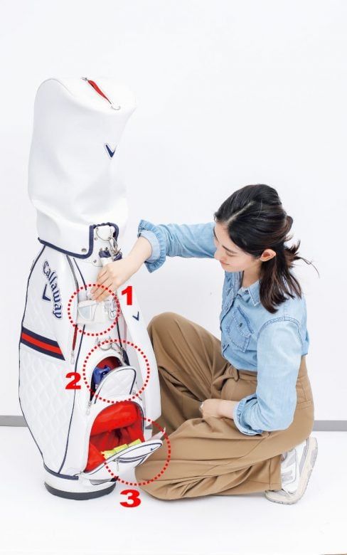 まず、キャディバッグのポケットをフル活用するには、中に入っているものを全部取り出すこと! その後、位置やサイズを考慮したうえで何をどう入れるか、バッグに合わせてアレンジしてみてください。