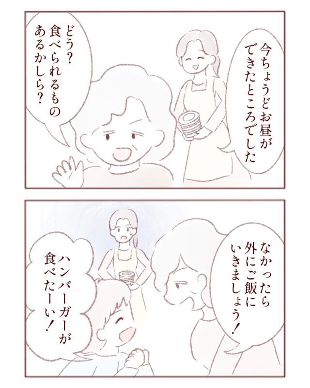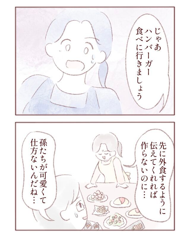 義母は食卓に並んだ料理を確認して、浩二さんの子どもたちに「どう?食べられるものあるかしら?」と聞きました。返事を聞く間もなく、「なかったら外にご飯に行きましょう!」と外食に誘ったのです。外でご飯と聞いて、子どもたちは「ハンバーガーが食べたーい」と大喜び。