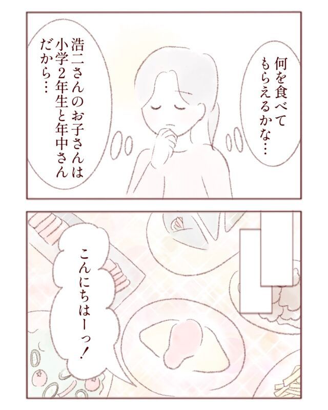 小学2年生と年中さんも喜んで食べてくれるようなメニューを考えて、手巻きずしやオムライスなど、いろいろな料理を準備しました。ちょうど準備が整った頃、「こんにちはー」と元気な声。浩二さん一家の到着のようです。