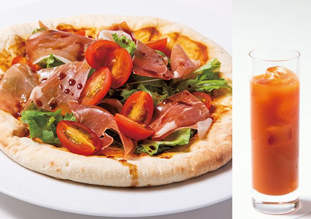 ▲大丸心斎橋店のイートインではOSMICトマトをトッピングした「サラダピッツァ」(1,320円)や、3種類のトマトカクテル(各1,100円)が味わえます