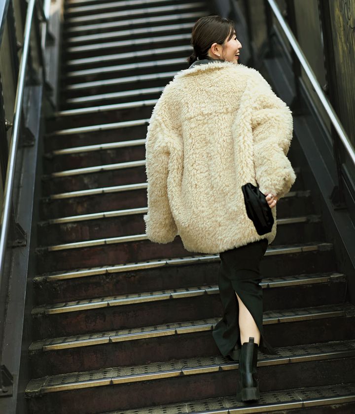 『ビッグサイズのアウターは可愛らしく見えるボアが最適。さらにキャミワンピ合わせのそのギャップが夫とのデートにちょうどいいんです。気分転換にリバーシブルで着られるのも◎。』
