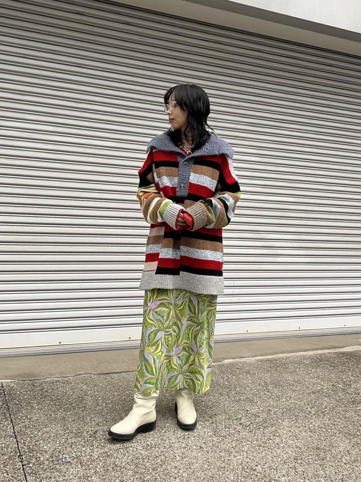 ポロニット¥71,500(ウエストヤーンプロジェクト/JOURNAL STANDARD 自由が丘店)、アイウェア¥52,800(ユウイチ トヤマ)、プリントスカートとヴィンテージのブーツ、その他は全て本人私物
