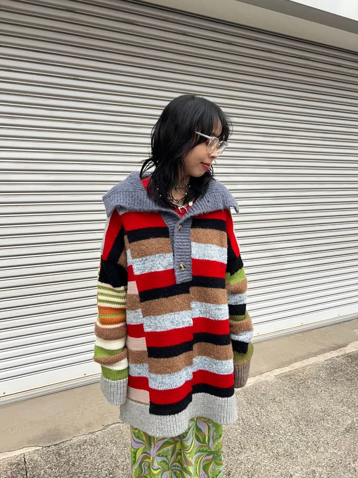 「ウエストヤーンプロジェクトは残糸を使用していて、アソートカラーで展開されるさらに特別なニットです。とにかく暖かくて1枚で着映えするので、寒い朝着るものに迷ったらついつい手が伸びてしまいそう。アウターから大きな襟を出してもかわいいし、その襟を立てると防寒対策もできる優れものです」ポロニット¥71,500(ウエストヤーンプロジェクト/JOURNAL STANDARD 自由が丘店)