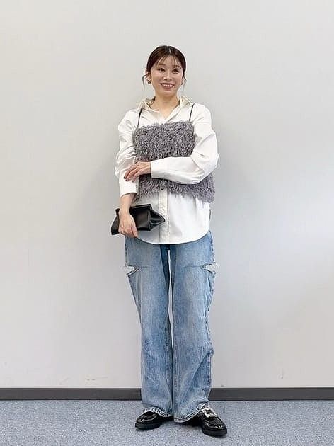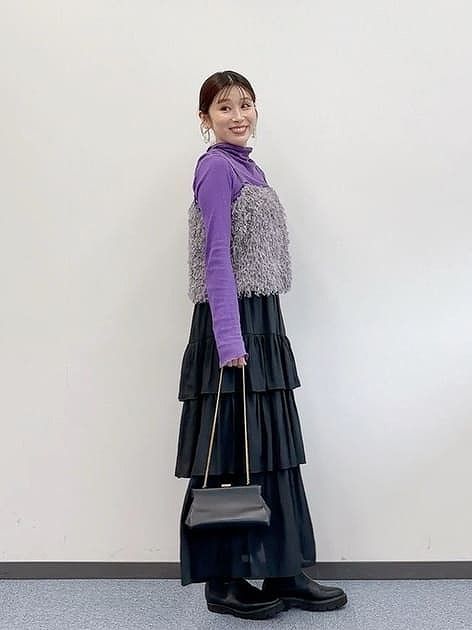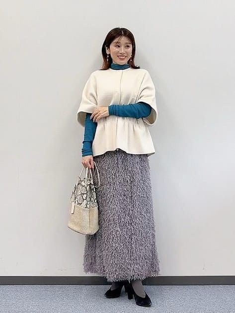 タートルと七分袖のレイヤードにシャギー素材が映えるこちらのコーデ。華やかさがありつつもほどよくゆったりとした着こなしに。ホワイトカラーとの相性も抜群です。