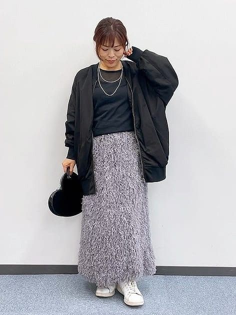 これからの時期活躍するシャギー素材がメインのスカートコーデ。タイトすぎないシルエットが幅広い着こなしを叶えてくれるアイテムです。今回は黒ブルゾンでハンサム度を上げた甘ニッシュなスタイルに仕上げました。