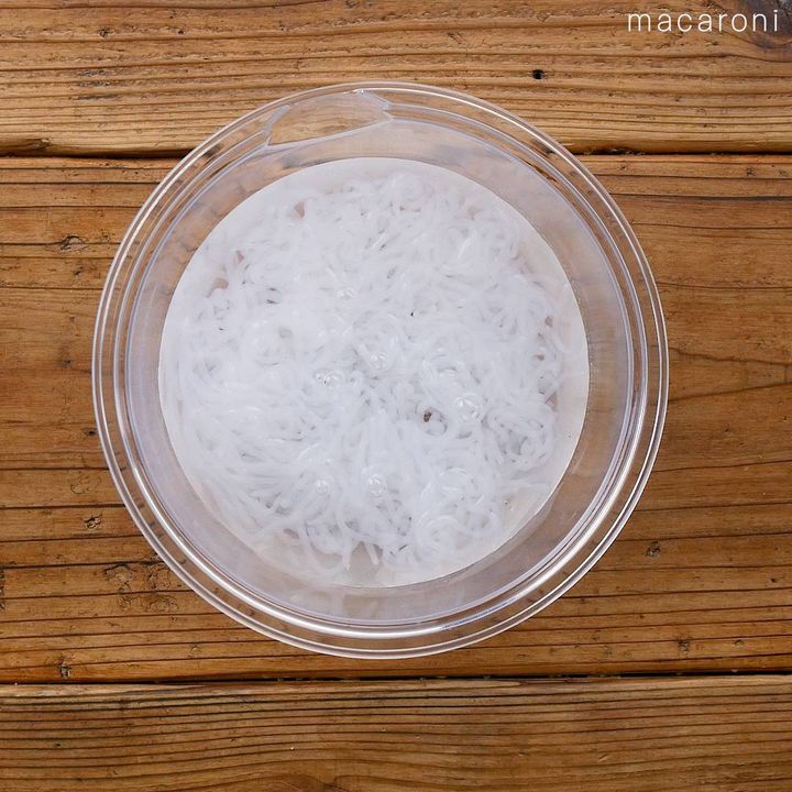 2: 耐熱ボウルに移してかぶるくらいの水(分量外)を加え、ラップをかけてレンジ600Wで5分加熱してアク抜きをします。取り出したらよく水気を切って器に盛ります。