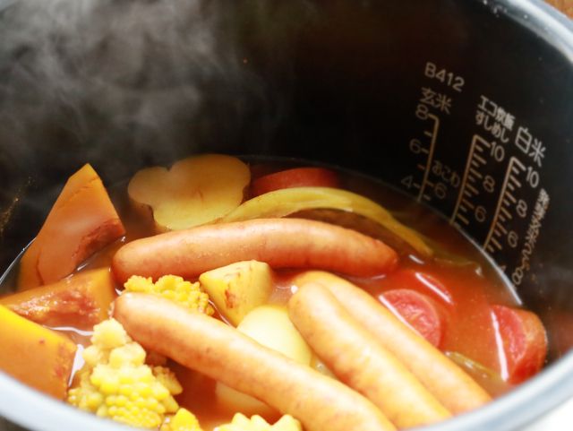 炊飯器にお任せして、あとは放っておくだけで、長時間煮込んだような野菜とろとろのポトフが出来あがります。