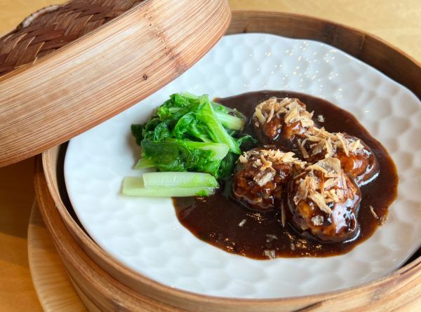 発酵した豆を原料とする豆豉ソースをたっぷりとかけた『原木しいたけの肉詰め 蒸籠蒸し』。使用されているのは、練馬区上石神井の農家さんが育てた原木椎茸です。菌床栽培とは異なり、原木椎茸は天然に近い環境で育つため、肉厚で香りが格別。ひとくち頬張ると、その弾力と芳醇な香りに驚かされます。中に詰められたミンチには絶妙な下味が施され、豆豉ソースと絡めて味わうと、椎茸とお肉が織りなす絶妙なハーモニーに感動を覚えます。