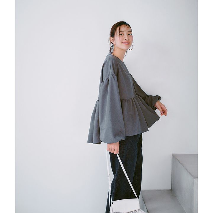 ブラウス¥19,800(ブラン)デニムパンツ¥35,200(ハイク/ボウルズ)ピアス¥8,800(アビステ)バッグ¥22,000(ノマディス/ノーベルバ)