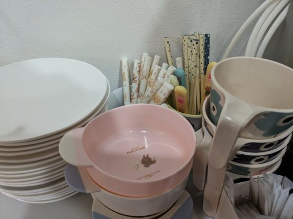 セルフ給水機の横には、子ども用の食器セットもありますよ。