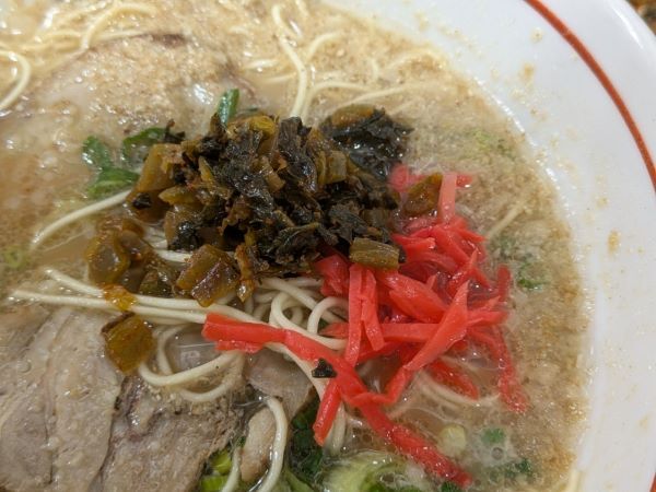 その隣にある、サービスの紅生姜と辛子高菜を盛り付け、写真を撮って振り返ると、もう着丼していました。博多ラーメンの出来上がりの速さに改めて驚きます。