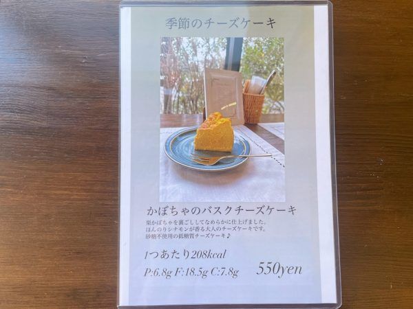 こちらは季節限定、かぼちゃのバスクチーズケーキです。1つあたり208カロリーとのこと!