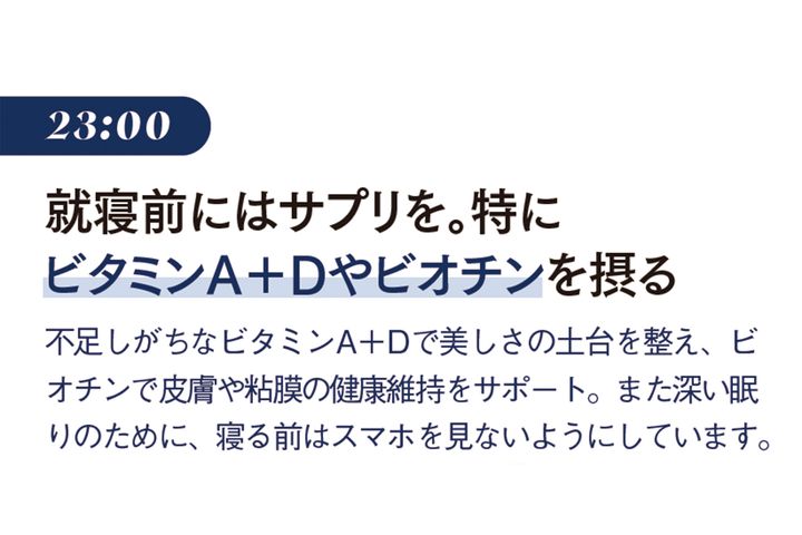 不足しがちなビタミンA+Dで美しさの土台を整え、ビオチンで皮膚や粘膜の健康維持をサポート。また深い眠りのために、寝る前はスマホを見ないようにしています。
