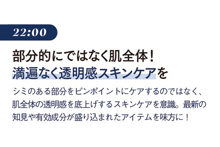 シミのある部分をピンポイントにケアするのではなく、肌全体の透明感を底上げするスキンケアを意識。最新の知見や有効成分が盛り込まれたアイテムを味方に!