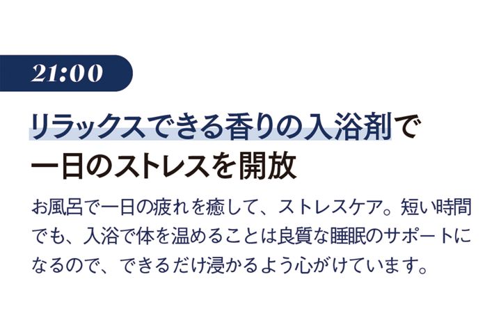 お風呂で一日の疲れを癒して、ストレスケア。短い時間でも、入浴で体を温めることは良質な睡眠のサポートになるので、できるだけ浸かるよう心がけています。