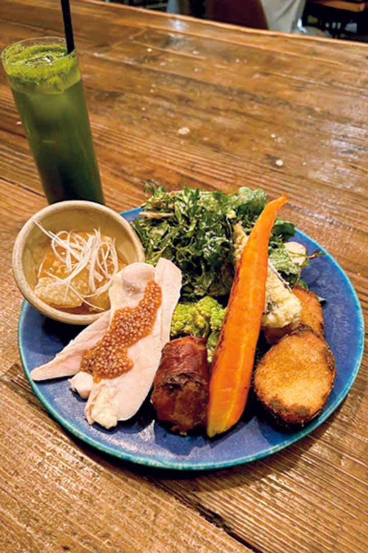 『食事に関しては夜に限らず、添加物や白砂糖、酸化した油を使った料理は避けています。写真はケールサラダと鶏ハム、里芋とごぼう、にんじん、ロマネスコのフライ。できるだけオーガニック野菜を選んでいます。』