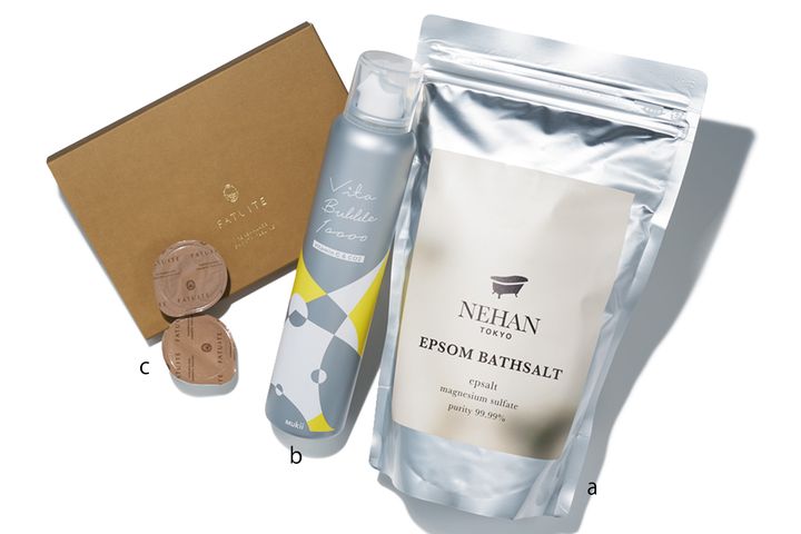 a.「発汗やデトックスを促す、高純度硫酸マグネシウム。うるおいを与えて、肌を整える効果も」エプソルト 800g ¥3,080(ネハントウキョウ) b.「ビタミンC誘導体を閉じ込めた炭酸パックで、肌も血行促進。毛穴汚れやくすみ対策に有効です」ビタバブル 10000 ¥4,290(mukii) c.「毎日使えるくらい肌負担のないピーリング。1回でつるんとして、凹凸のない肌に!」リニューアレイジ スムースピーリング 3.5㎖×6個 ¥6,160(FATUITE)
