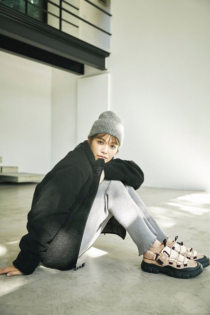 スニーカーサンダル¥20,350(emmi×SHAKA)、ブルゾン¥35,750、ニットレギンス¥6,930、ニットキャップ¥8,800、ピアス¥4,620(全てエミ/エミ ニュウマン新宿店)