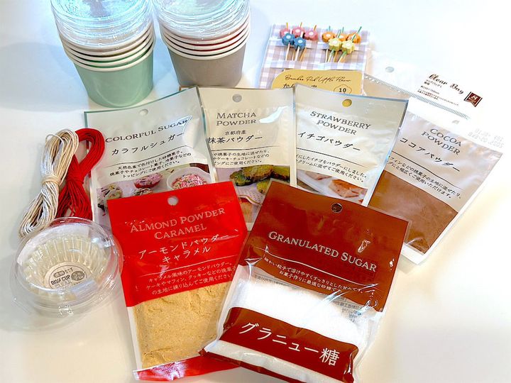 イチゴパウダーや抹茶パウダーなどのトッピング材料、ラッピング材料はすべて100均で購入。