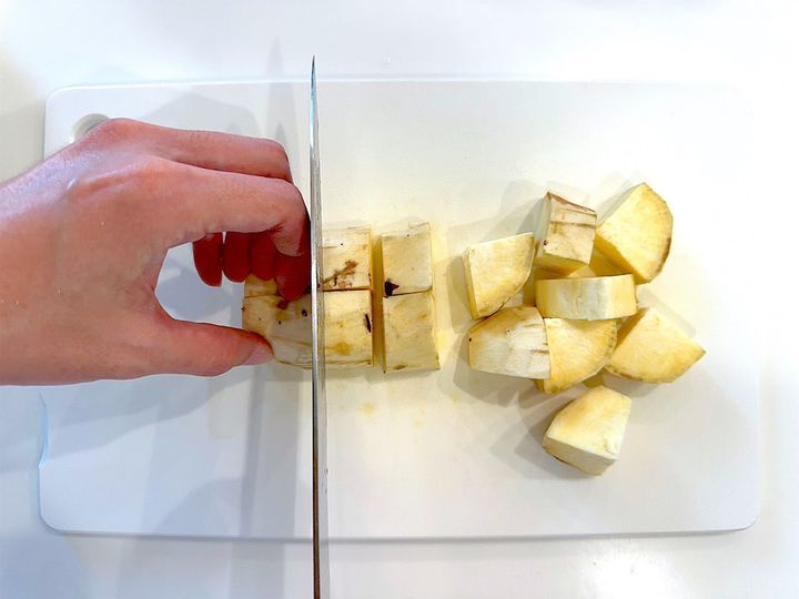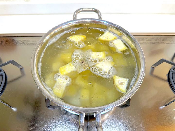 2. 1を竹串が通るくらいまで茹でたら、湯をよく切る。