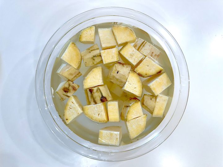 1. さつまいもは皮を剥き、1.5cm厚さのイチョウ切りにして、水に浸しアク抜きする。