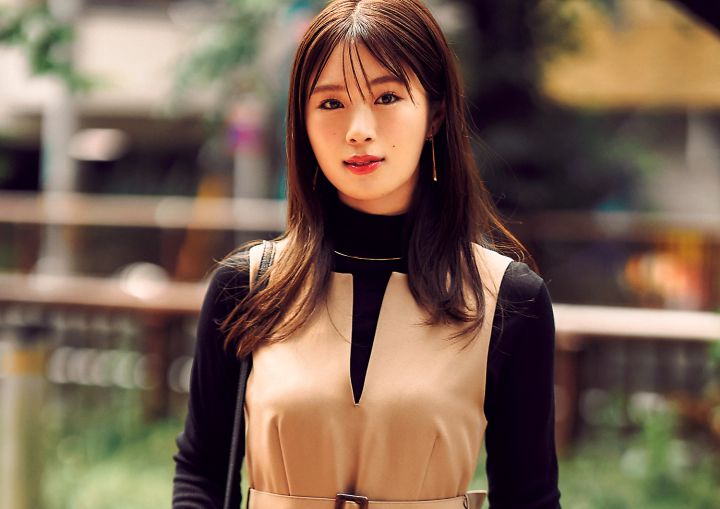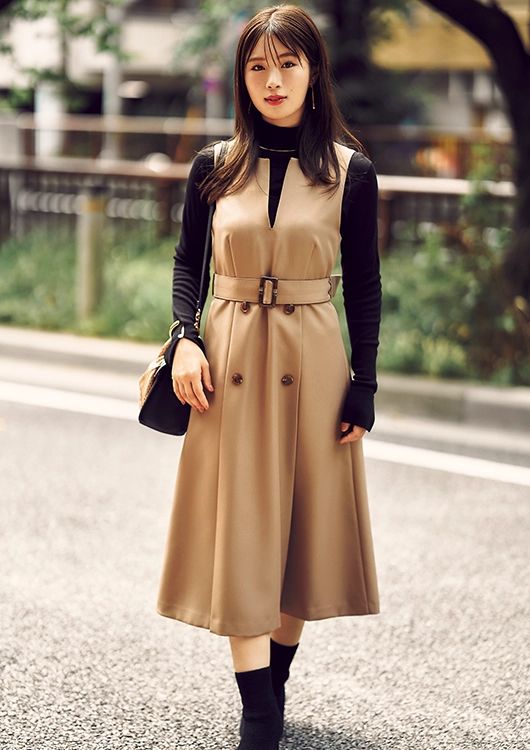 真面目なトレンチ風ジャンスカがあか抜けて見えるのは、スリットネックと高めのウエスト切り替えで、着こなしにメリハリが生まれるから。