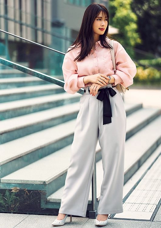 抜け感を出せるシアーシャツをタックイン!ウエストをマークしたメリハリのあるスタイリングで、着痩せも女らしさも引き立てて。