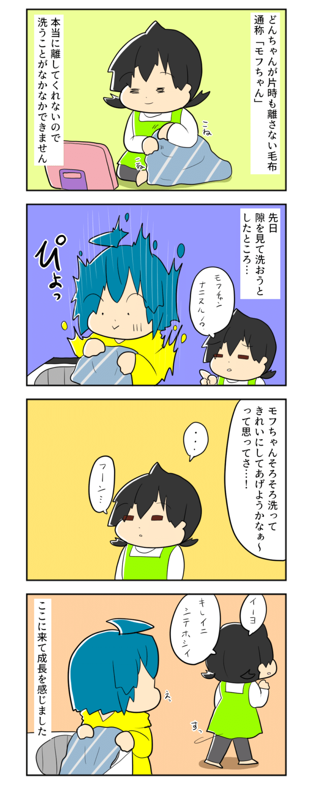 娘が片時も離さなかった毛布をこっそり洗濯。見つかって嫌がると思いきやすんなりOKで成長を感じた|mochikoの育児マンガ