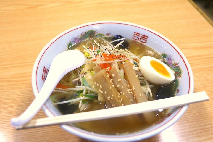 ラーメンには大鰐温泉もやしをはじめ、たくさんの野菜がトッピングされ、旨味が塩ベースのスープにしっかりと溶け込んでいます。細い縮れ麺がスープと絶妙に絡み合い、心温まる優しい味わいです。