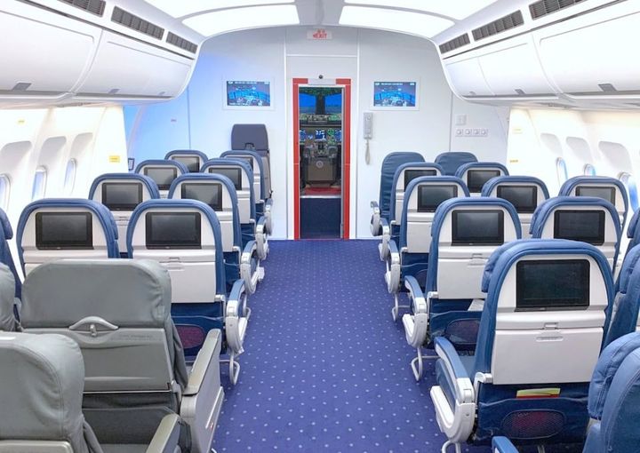 コックピットにズラリと並ぶのは、本物の飛行機のスイッチやボタン。プロの操縦士が訓練で使用する本格的なフライトシミュレーター「ボーイング777」を搭載した空間です。操縦士技能の資格を持つインストラクターに教えてもらいながら、飛行機の操縦体験ができちゃうんです。離着陸の操縦体験を中心に、世界約45,000も(!)あるという主要な空港から、好きな飛行ルートや時間を設定し、インストラクターと一緒に飛行計画をプランニング(楽しい)。希望があればパイロットシャツにも着替えられるので、気分も一層上がること間違いなし! 体験後は、隣接しているキャビンモックアップ「客室」でくつろぐことも。