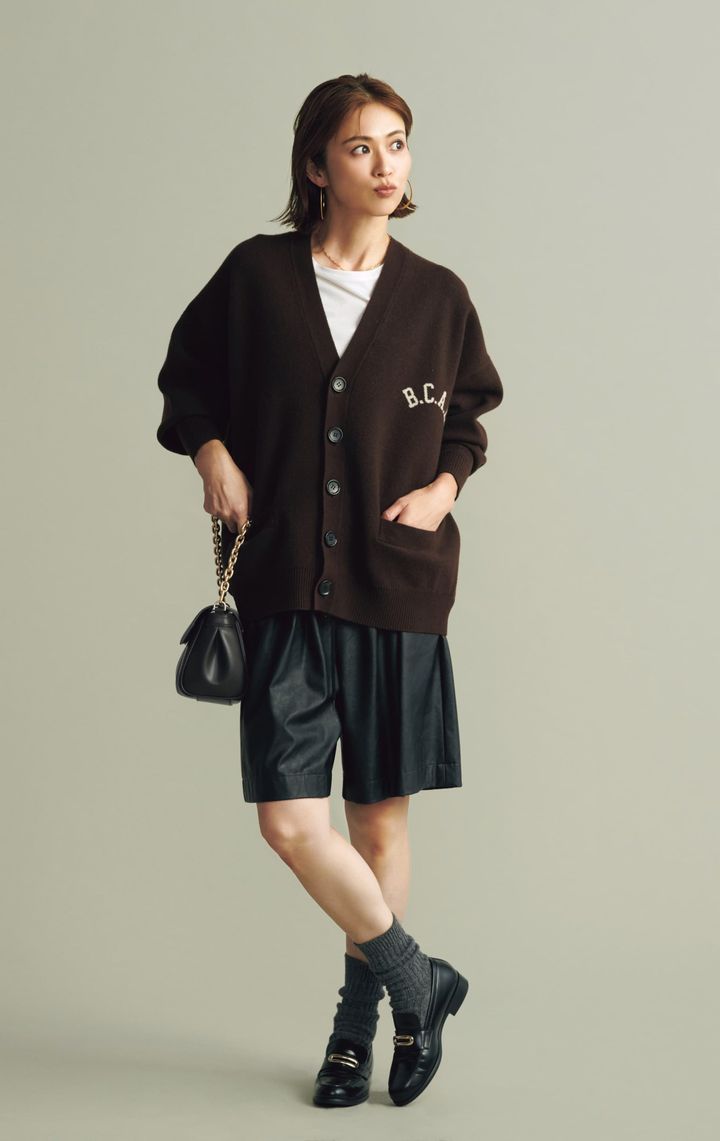 ローファー[H3㎝]¥79,200(ペリーコ/アマン)靴下¥1,760(エイチフットウェア/ル タロン グリーズ ルミネ新宿店)カーディガン¥26,400(セント ジョンズ サード クラブ/アマン)Tシャツ[キャミブラウス付き]¥9,900(リリアン カラット)ハーフパンツ¥29,700(サクラ/インターリブ)バッグ¥13,900(CHARLES & KEITH)ピアス¥72,600(マリハ)ネックレス¥27,500(リューク)