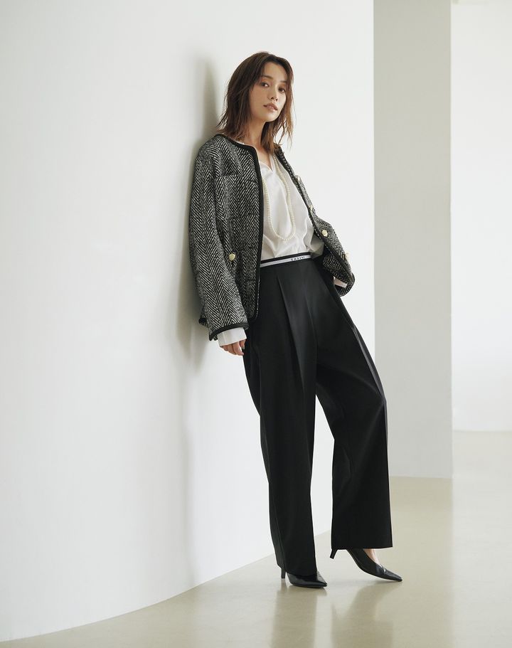 秋の必須アイテム、ジャケットはツイード素材をセレクト。ジャケットとパンツはあえてワイドなシルエットにすることで、コンサバ感を控えめに、けれどもスタイリッシュな印象にしてくれます。ポイントはもちろんウエストロゴのデザイン。オフィスシーンでもお出かけシーンにも◎なコーデです。