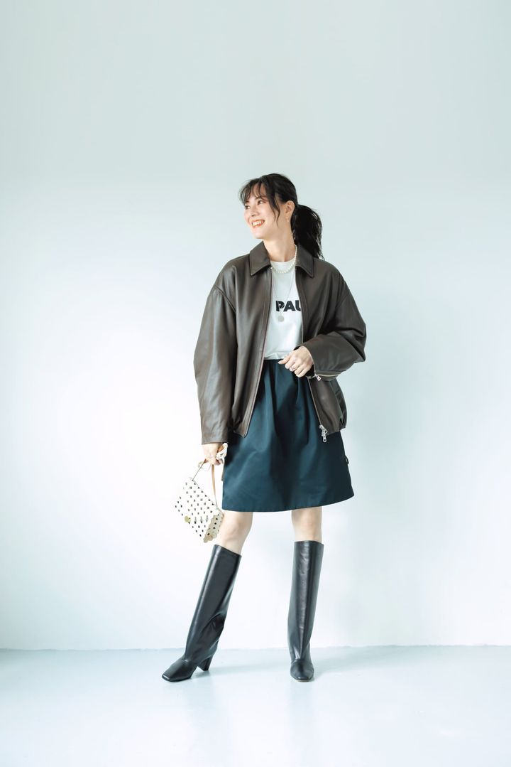 ちょっとした場でも華やかさをプラスできるレザーブルゾンは朝夜の寒暖差のある季節の体温調節に便利。ミニスカは広がりすぎずタイトすぎずに、男前のレザーでミニの甘さをフォローすれば甘すぎない大人っぽい印象に。