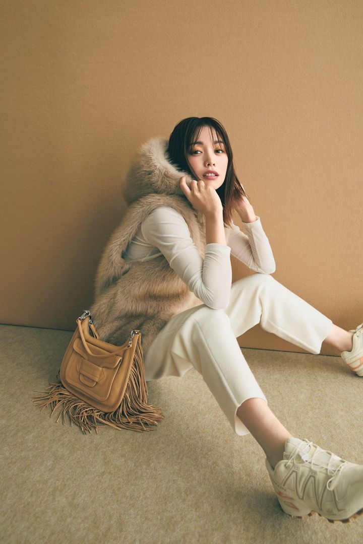 ジレ¥57,200(プルミエ アロンディスモン)ベロアトップス¥11,000(マカフィー/トゥモローランド)パンツ¥35,200(ロエフ/エイチ ビューティ&ユース)バッグ¥213,400(ピエール アルディ/ピエール アルディ 東京)スニーカー¥26,400(サロモン/エミ ニュウマン新宿店)