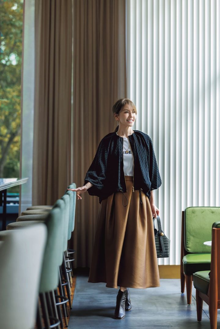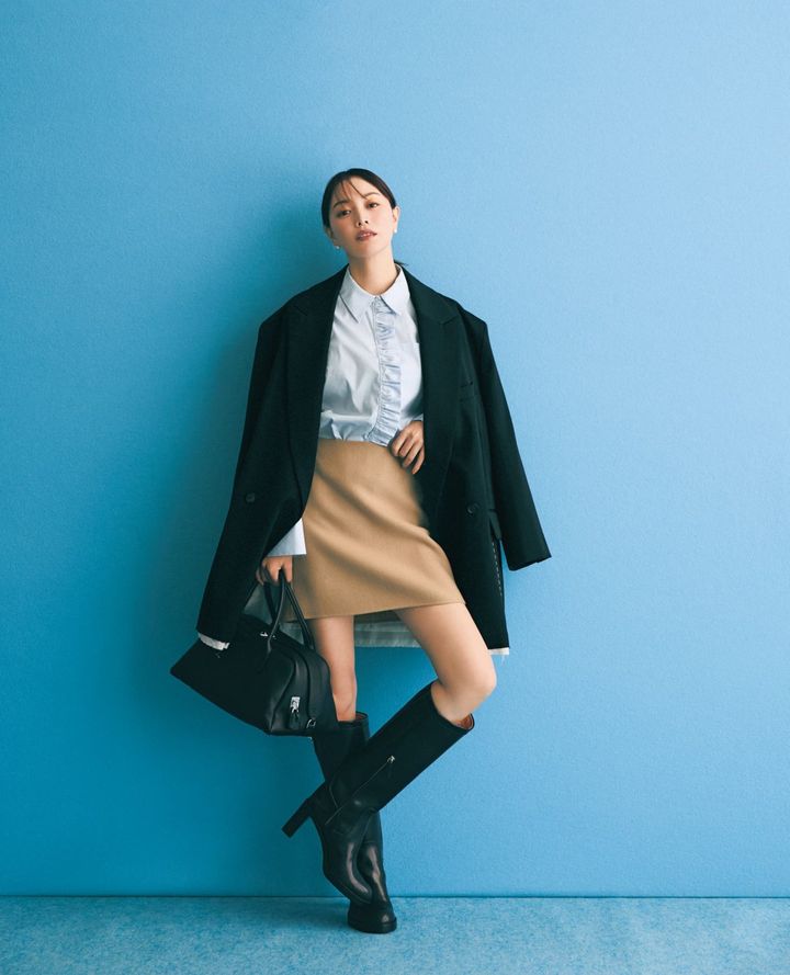 スカート¥26,400(エストネーション)ジャケット¥36,300(メゾンスペシャル/メゾンスペシャル 青山店)ブラウス¥35,200(バウム・ウンド・ヘルガーテン/エスアンドティ)バッグ¥413,600ブーツ¥289,300(ともにトッズ/トッズ・ジャパン)ピアス¥9,900(カラ・ユ/ショールーム ロイト)