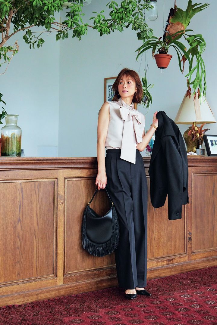 細身パンツのコンサバ感は年齢を重ねた印象になってしまう……そんなときはワイドタックパンツをセレクト。胸元のビッグリボンもジャケットとタックパンツでスタイリッシュに見せてくれます。遊びを利かせたバッグを合わせれば、オフィスシーン以外でも使えるスタイルに。