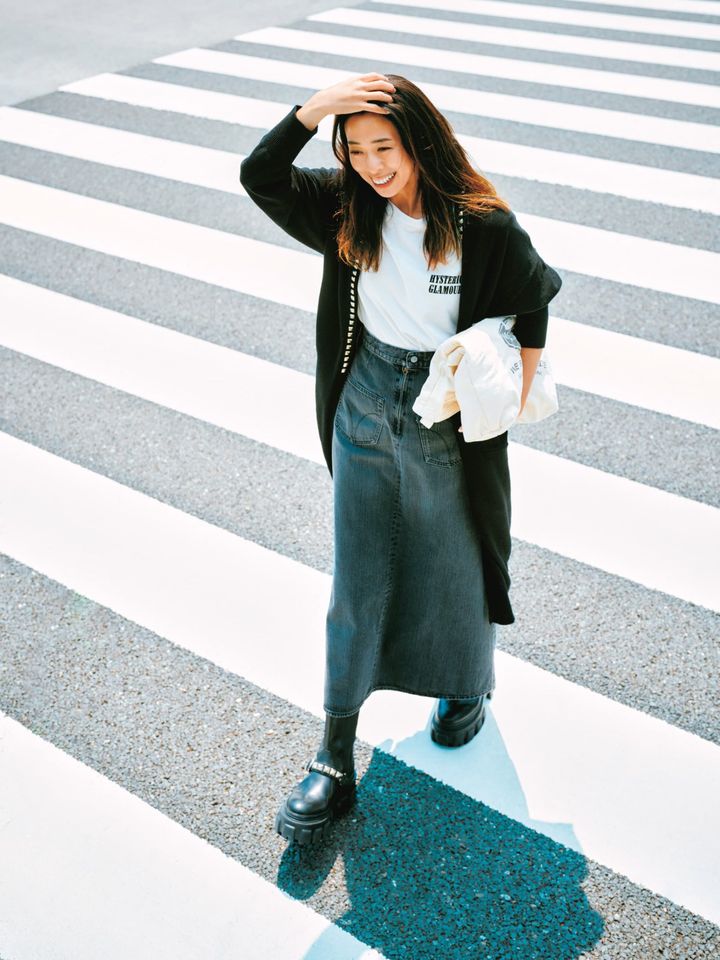 シルバースタッズ付きロングカーディガン¥49,500ロゴTシャツ¥14,300ハイウエストデニムロングスカート(後ろを前にして着用)¥39,600 2WAYロゴトートバッグ¥13,200スタッズ付きサイドゴアブーツ¥39,600(すべてHYSTERIC GLAMOUR/ヒステリックグラマー)
