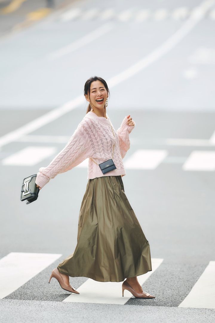 24.大人ピンクと締め色カーキで媚びない甘さを演出