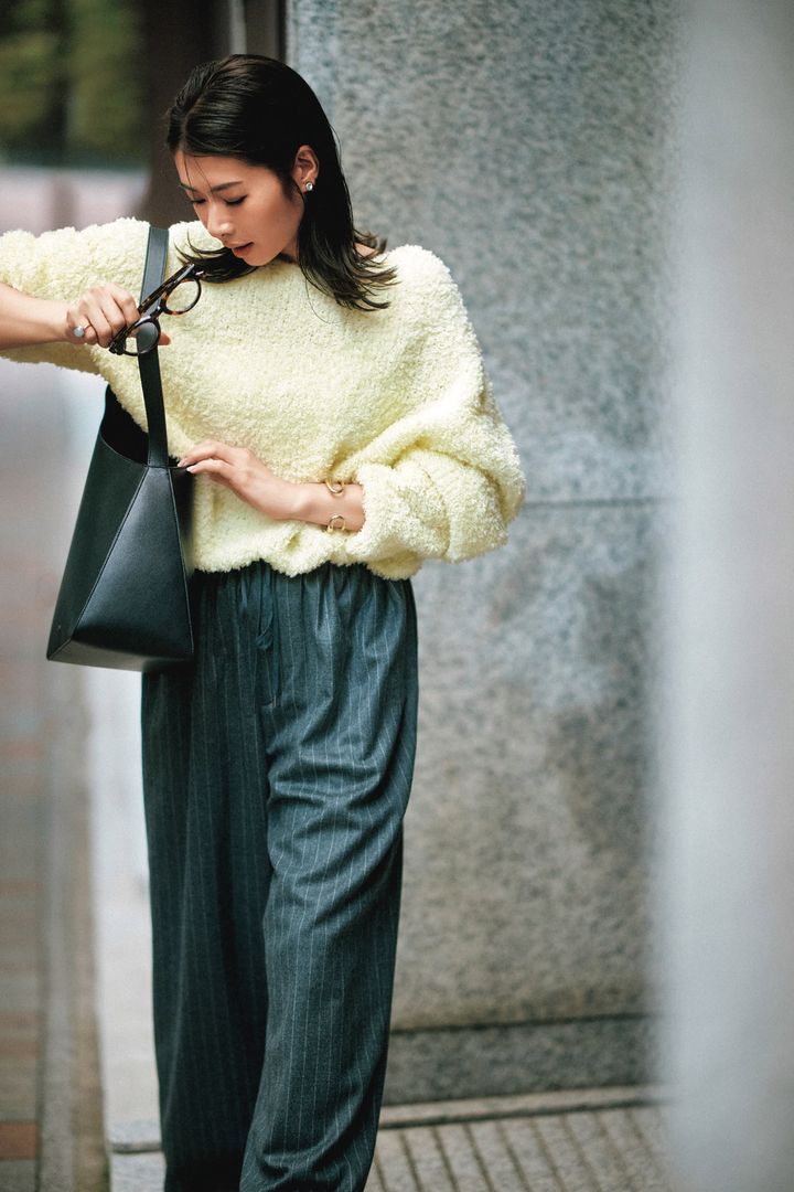 甘カワなふんわりニットの「たまご色」は肌馴染みの良さが魅力。キュートなニットもピンストライプのパンツを合わせて引き締めれば、もこもこニットも仕事仕様に。寒暖差のある日には、コートを合わせるのも⚪︎。