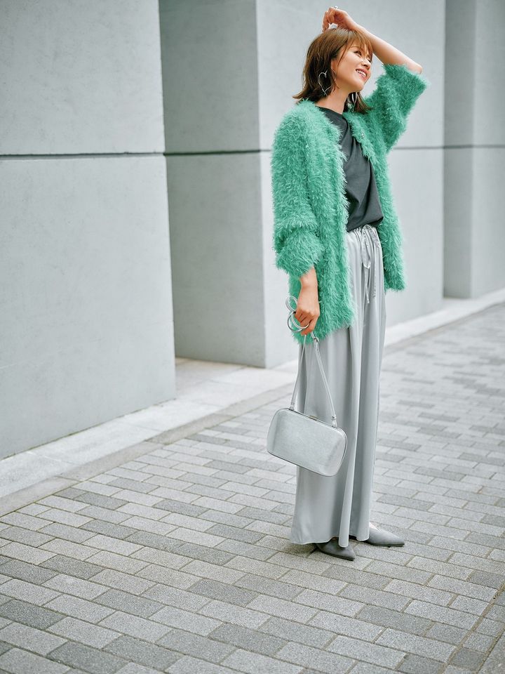 ヴィヴィッドな挑戦カラーを知的かつやさしげな印象に昇華してくれるグレー。どんな色でも受け止めてくれる包容力が魅力です。今秋は、グレー×○○で一歩踏み出してみては。薄手のゆるっとパンツには秋らしいふわもこカーディガンを合わせてゴージャスさをプラス。