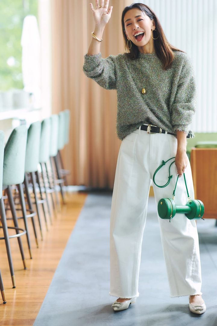 ラメニット¥37,400(アルアバイル/アルアバイル)デニムパンツ¥17,600(サロン アダム エ ロペ)バッグ¥93,500(ロンシャン/ロンシャン・ジャパン)パンプス¥41,800〈ピッピシック〉ベルト¥28,600〈アトリエ アンボワーズ〉ピアス¥16,500(すべてフィリップ オーディベール/TOMORROWLAND)ネックレス¥42,900(ミショー/ハウス オブ ロータス)リング¥16,500(メラキ/フラッパーズ)バングル¥44,000(サスキアデイツ/ハウス オブ ロータス)