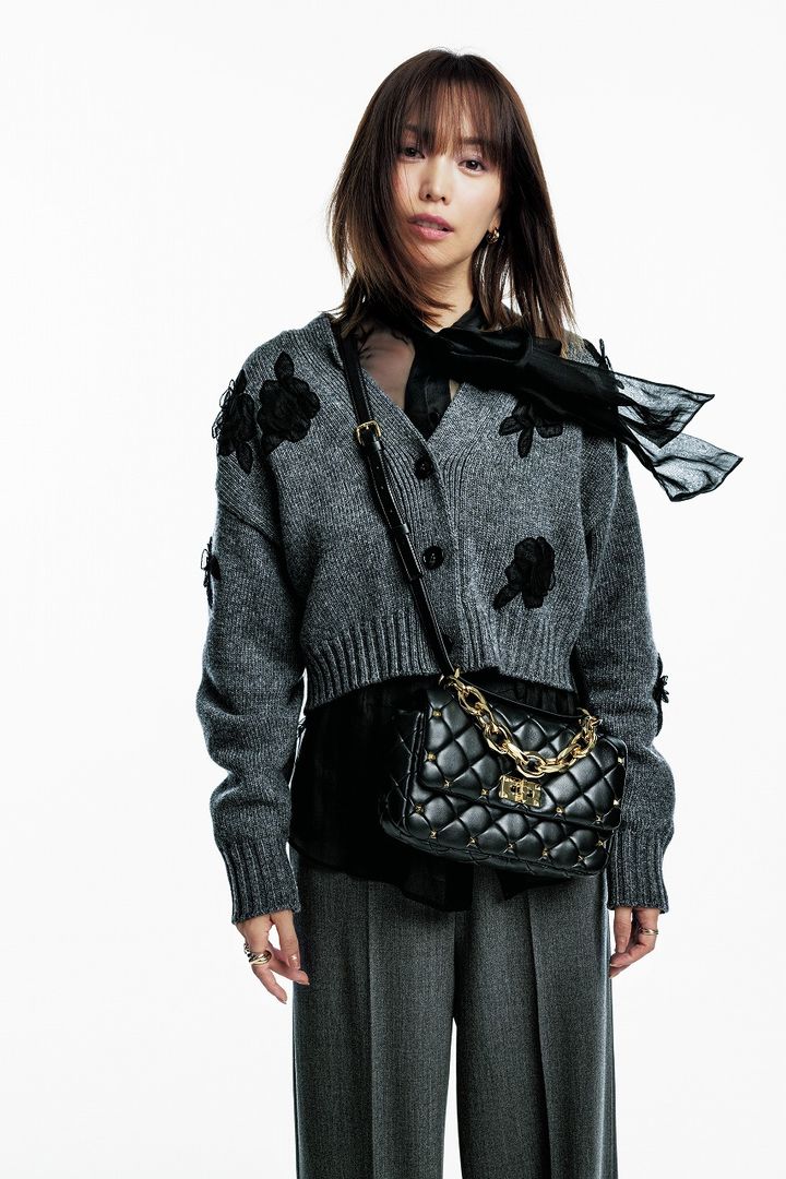 カーディガン¥462,000ブラウス¥192,500パンツ¥264,000〈すべてヴァレンティノ〉バッグ¥492,800シューズ¥182,600〈ともにヴァレンティノ ガラヴァーニ〉(すべてヴァレンティノ インフォメーションデスク)イヤリング¥500,500人差し指リング¥962,500薬指リング¥605,000(すべてカルティエ/カルティエ カスタマー サービスセンター)
