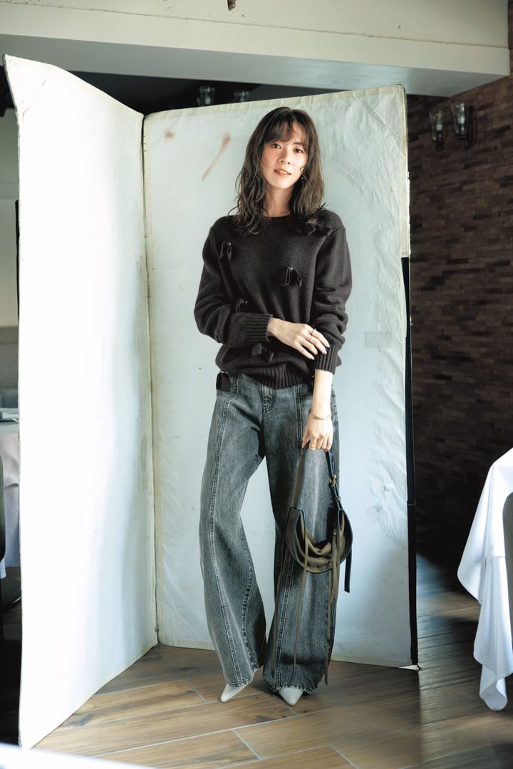 ニット¥41,800(SEA/エスストア)デニムパンツ¥22,000(アルアバイル)バッグ¥86,900(ラディカ スタジオ/アマン)パンプス¥64,900(ブレンテッラ/ハウス オブ ロータス)ダブルフィンガーリング[右手中指・薬指]¥38,500(モニス/フォーティーン ショールーム)バングル¥3,900〈soie〉リング[左手人差し指]¥15,400〈ジュゲ〉リング[右手人差し指]¥19,800〈masae〉(すべてロードス)