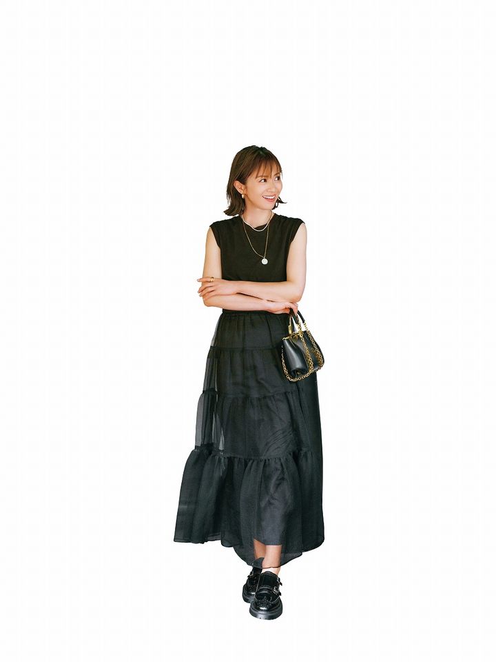 華やかなラメニットは肩掛けもできるカーディガンが万能。重くなりがちな冬の黒はチュールスカートで柔らかで軽やかな印象に。全身素材感のあるファッションで華やかさアップ間違いなし。